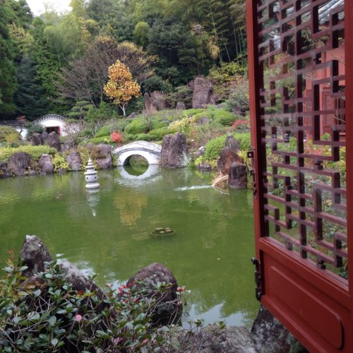 冠嶽園で庭を眺める